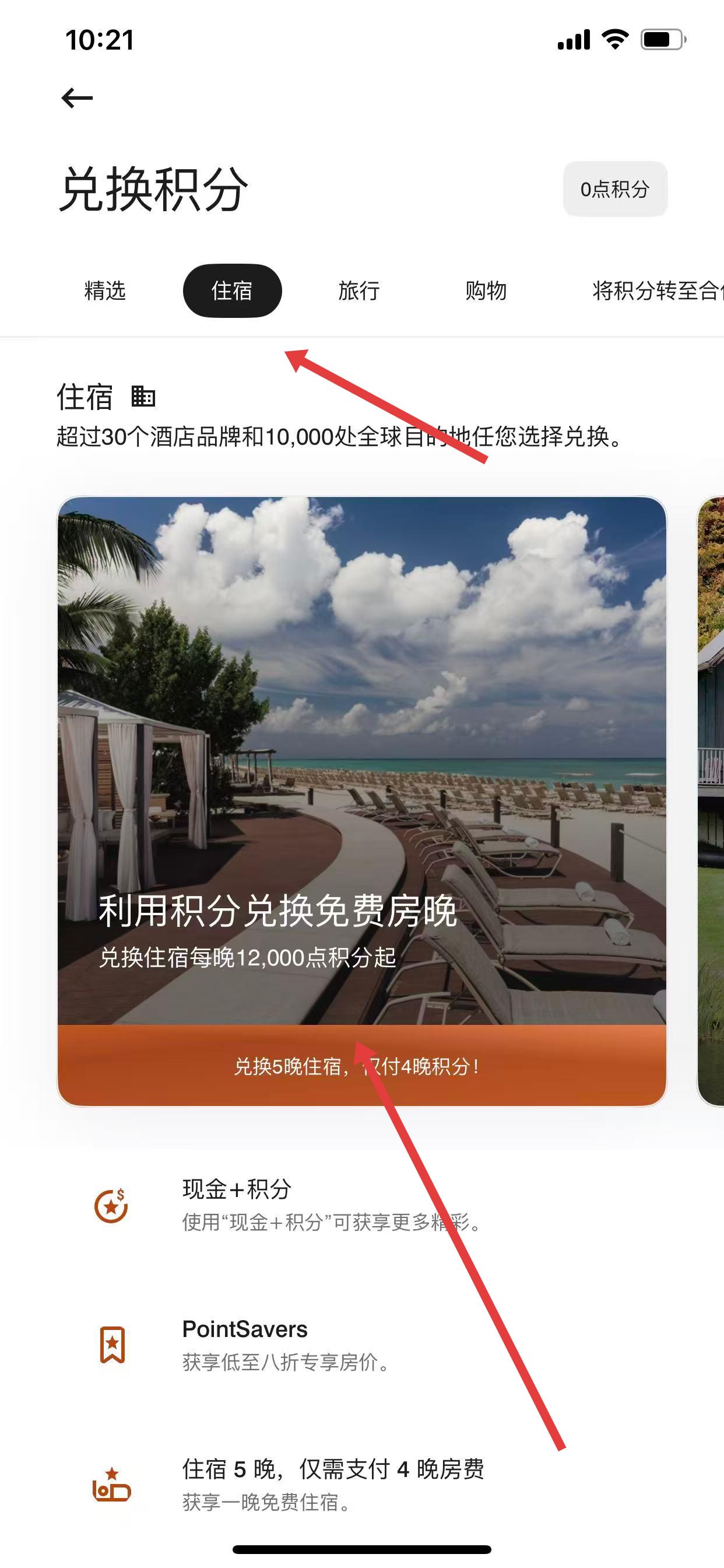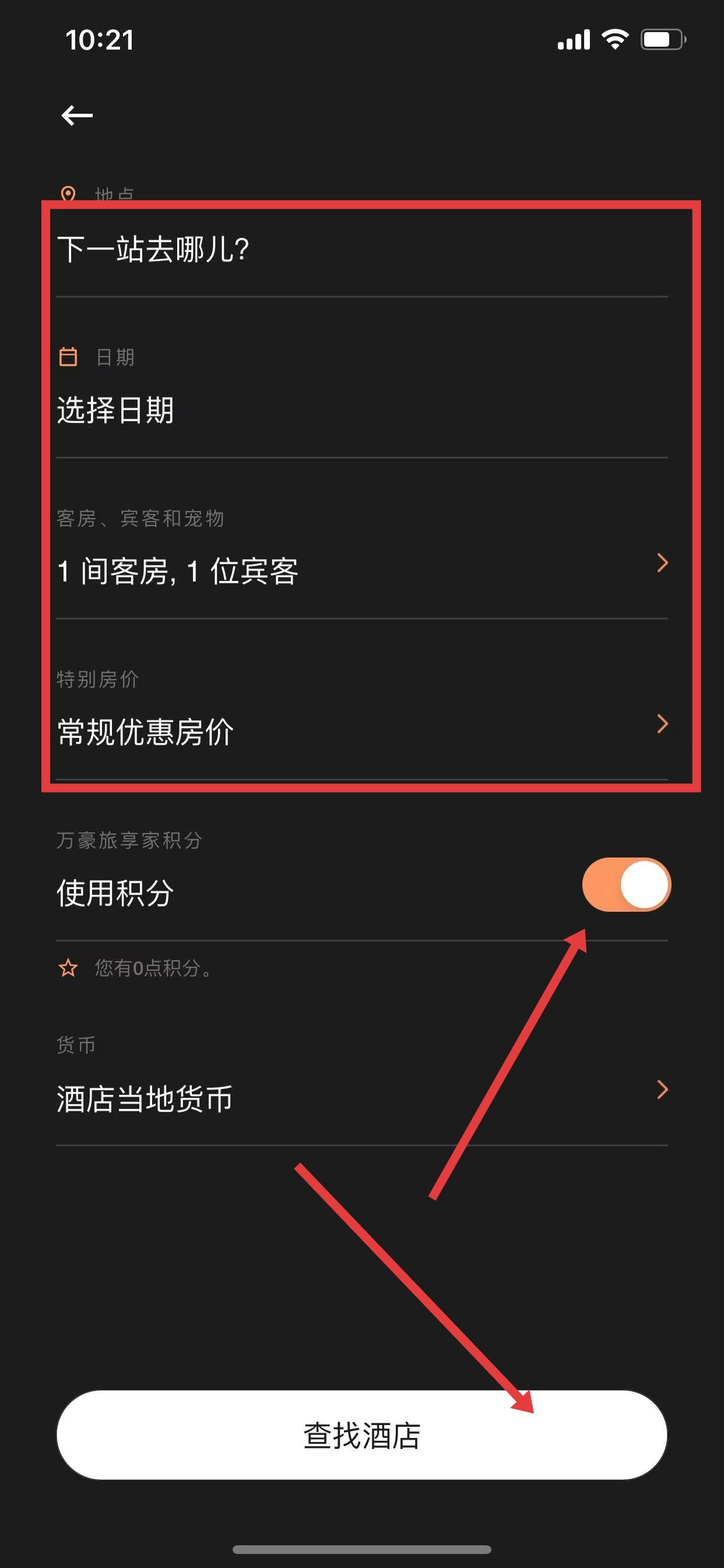 4、在住宿兑换界面,设置目的地、日期等信息,开启使用积分开关。