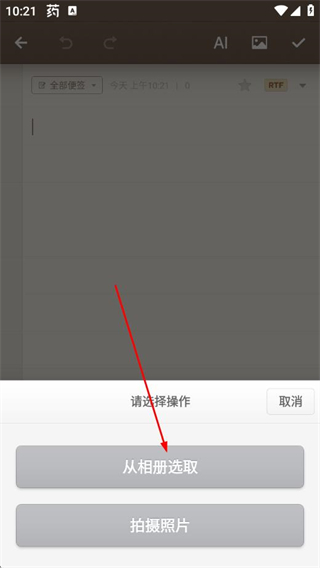 3、在操作选择框中选择从相册选取,即可将图片添加到便签中。