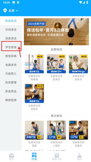 2、在分类页面,点击学生陪读分类,进入学生陪读服务列表页。