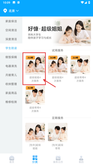 3、在学生陪读服务列表里,选择超级姐姐4次服务2小时条目,进入服务详情页。