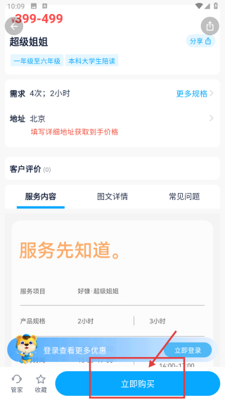 4、在服务详情页,点击立即购买按钮,进行该陪读服务的购买操作。