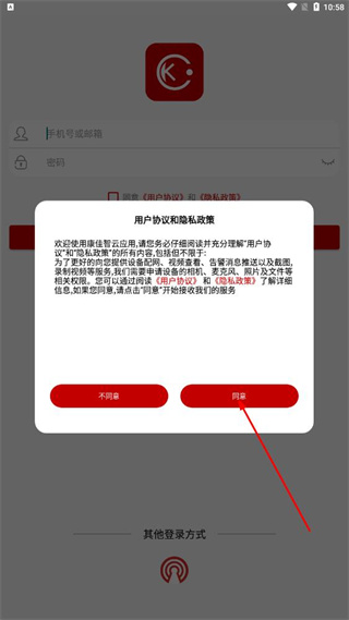 1、在用户协议和隐私政策弹窗中,点击同意,进入登录页面。