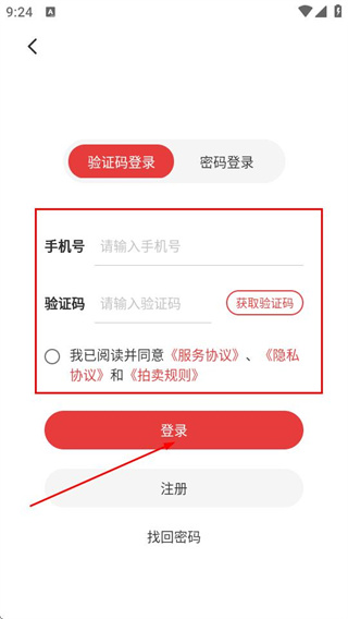 3、在登录页面选择验证码登录,输入手机号和验证码,勾选协议后点击登录完成操作。