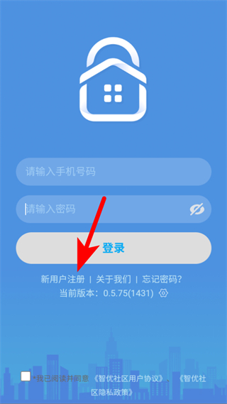 1、打开智优社区APP,在登录页面点击新用户注册选项。