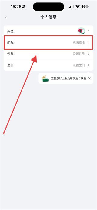 3、在个人信息页面,点击昵称选项,进入修改昵称页面。