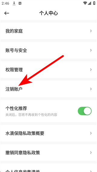 3、在个人中心页面,点击注销账户选项,进入水滴保注销账户页面。