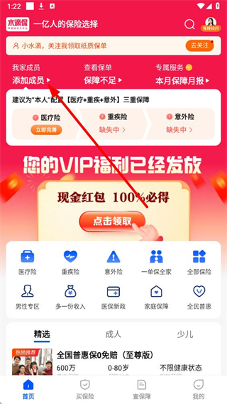 1、在水滴保首页,找到添加成员选项,点击进入我的家庭保障页面。
