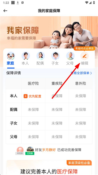 2、在我的家庭保障页面,找到编辑按钮,点击进入家庭成员管理页面。