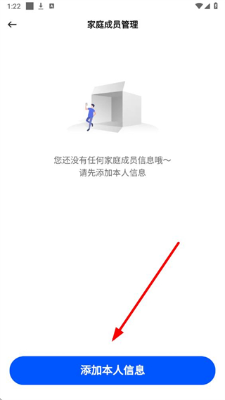3、在家庭成员管理页面,点击添加本人信息按钮,进入添加本人信息页面。