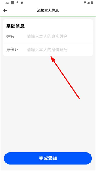 4、在添加本人信息页面,输入真实姓名和身份证号,点击完成添加按钮即可。