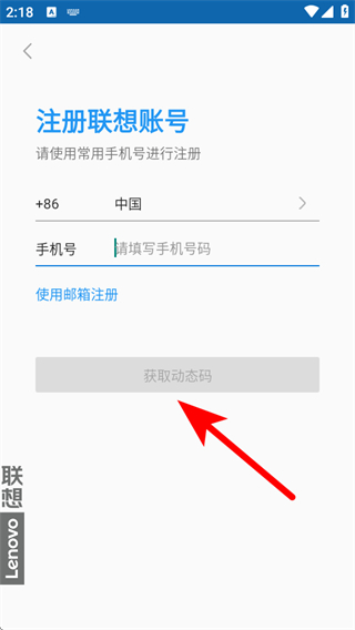 3、在注册联想账号页面,填写常用手机号,点击获取动态码。