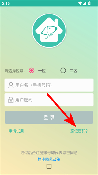 1、打开金牌管家APP登录页面,点击忘记密码选项。
