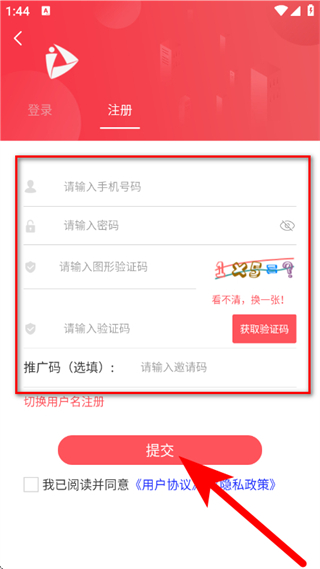 4、输入手机号码、密码、图形验证码、验证码,勾选已阅读并同意后,点击提交,完成注册。