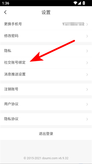 3、在设置界面里,点击社交账号绑定选项,进入社交账号绑定页面。