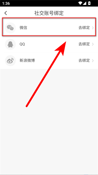 4、在社交账号绑定页面,点击微信右侧的去绑定按钮,按提示完成微信账号绑定。