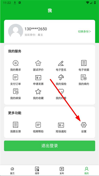 1、进入无忧阿姨APP我的页面,在更多功能区域点击设置。
