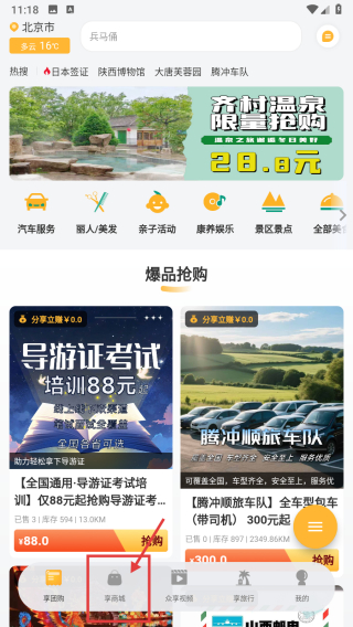1、打开旅游服务类APP,点击底部享城选项,进入享城页面。