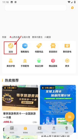 2、在享城页面,点击运动分类,进入运动类服务列表页。