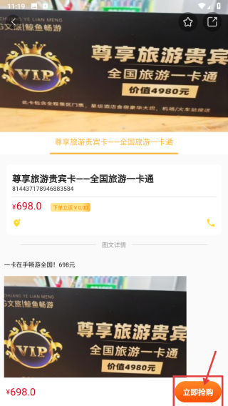 4、在产品详情页,点击立即抢购按钮,进行该旅游卡的购买操作。