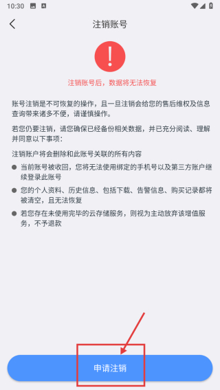 4、在注销账号确认页面,点击申请注销按钮,完成账号注销操作。