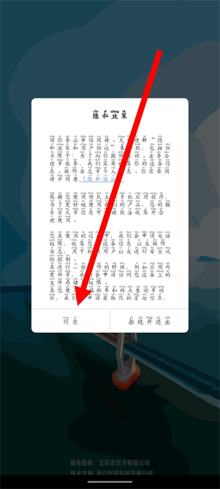 1、打开便民玉环乘车码,在隐私政策弹窗中,点击同意。
