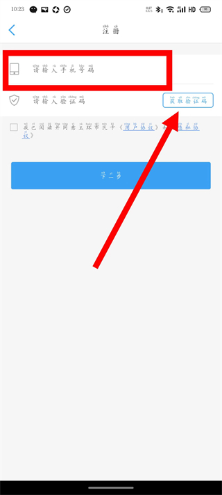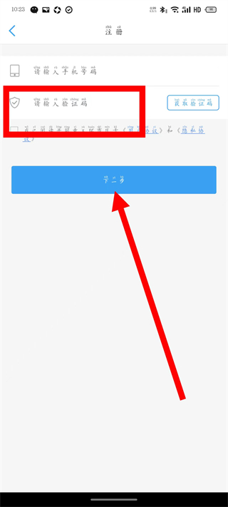 4、输入验证码,勾选同意后,点击下一步,完成账号注册。