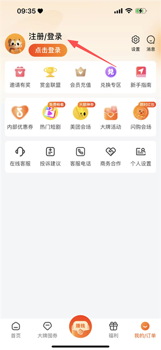 2、在个人页面,点击注册/登录,进入登录选择页面。