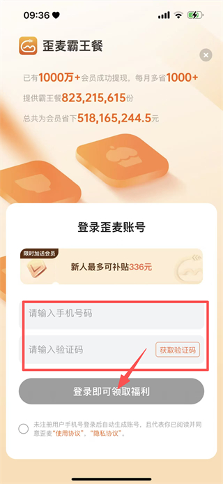 4、在输入手机号与验证码,点击登录即可领取福利,完成登录操作。