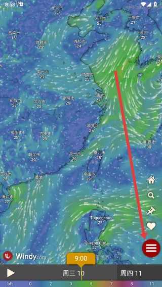 1、打开Windy app,点击右下角红色菜单按钮,展开功能菜单。