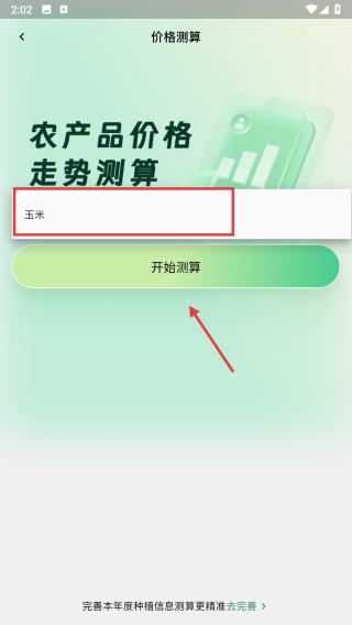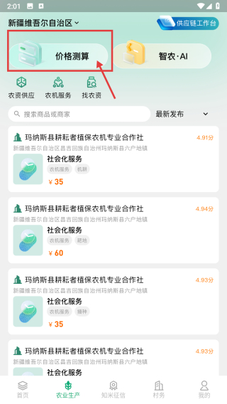 2、在农业生产页面,点击价格测算选项,进入农产品价格走势测算界面。