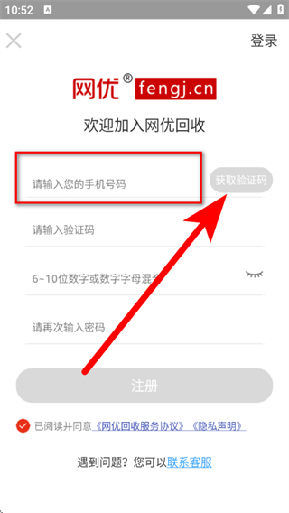 3、在注册页面,输入手机号码后,点击获取验证码。