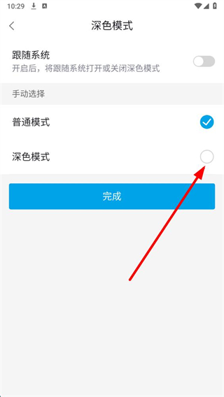 4、在深色模式设置页面,选择深色模式选项,点击完成按钮,即可开启深色模式。