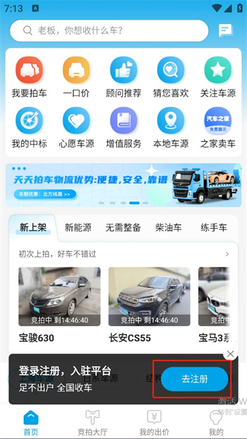 2、来到这款软件的首页中,在首页的下方直接就会有一个弹窗,点击后面的【去注册】注册一个自己的账号,开启这个全国收车之旅;