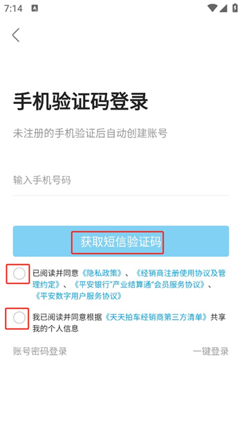 3、然后直接输入自己的手机号码,并且同意下方的两个条款,之后点击【获取短信验证码】前往下一步的注册操作中;