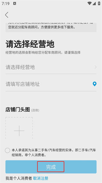 5、注册自己的账号之前,需要先完善自己的个人信息,在这里选择经营地、填写地址、拍摄门店然后同意条款,点击完成即可完成账号注册了。