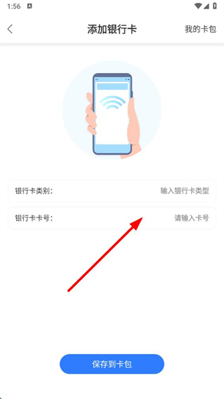 3、在添加银行卡页面,依次输入银行卡类别和银行卡卡号,点击保存到卡包按钮,完成银行卡添加。
