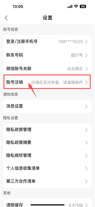 3、在设置页面,点击账号注销选项,进入账号注销页面。