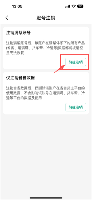 4、在账号注销页面,选择注销满帮账号,点击前往注销按钮,完成账号注销操作。