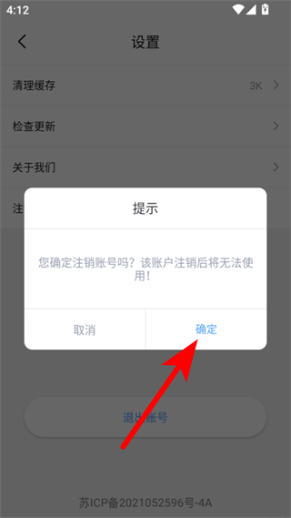 3、在设置界面里,点击注销账号选项,弹出注销确认提示框。