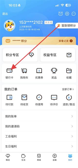2、在个人页面中,点击银行卡选项,进入我的银行卡页面。