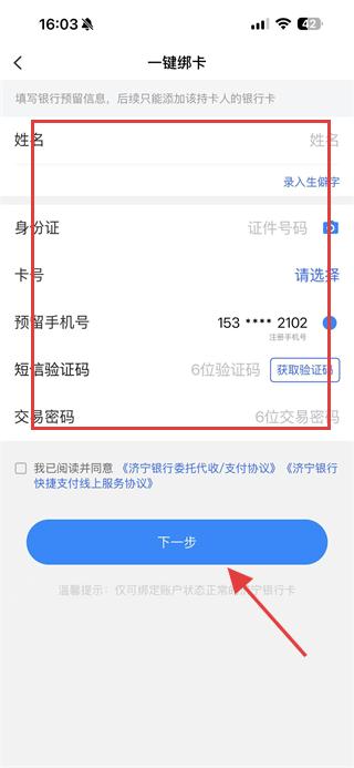 4、在一键绑卡页面,依次填写姓名、身份证、卡号、预留手机号,获取并输入短信验证码,设置交易密码,按提示完成银行卡绑定操作。