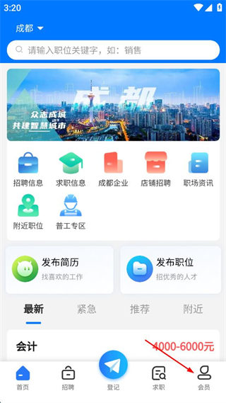 1、打开招聘APP,点击右下角“会员”,进入短信登录界面。