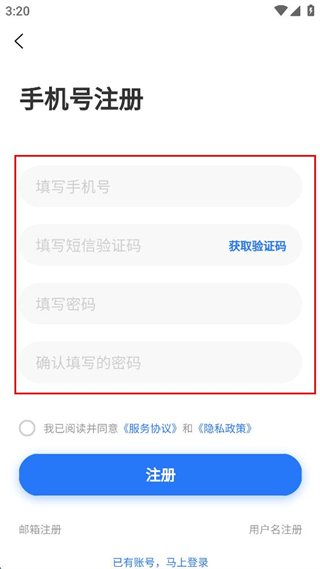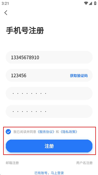 4、勾选同意服务协议和隐私政策,点击“注册”按钮。