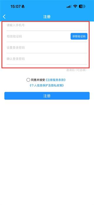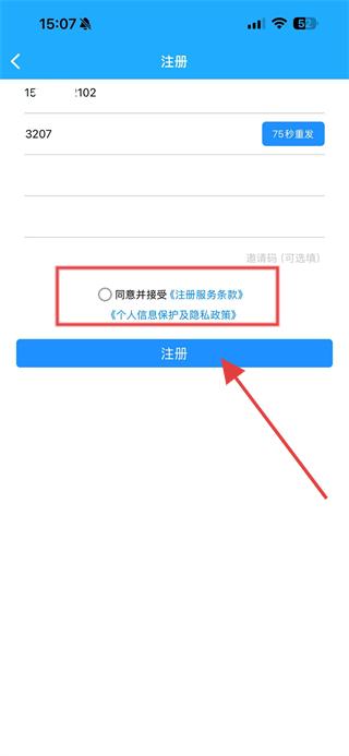 3、勾选同意并接受注册服务条款、个人信息保护及隐私政策,点击注册按钮,完成账号注册。