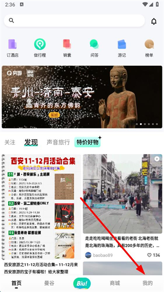 1、打开穷游APP,点击底部导航栏的商城选项,进入商城页面。