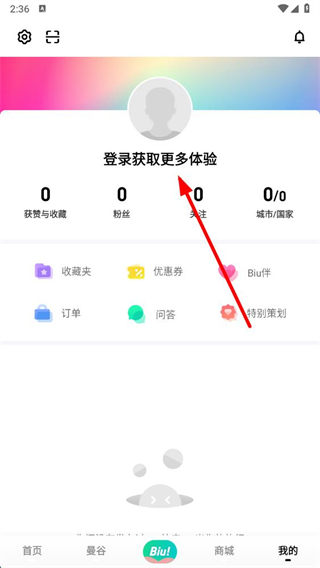2、在个人页面,点击登录获取更多体验,进入登录界面。