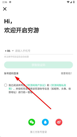 3、在登录界面,点击账号密码登录,进入账号密码登录页面。