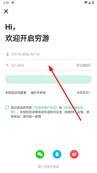 4、在账号密码登录页面,输入手机号/邮箱/用户名和密码,勾选同意协议后点击下一步完成登录。