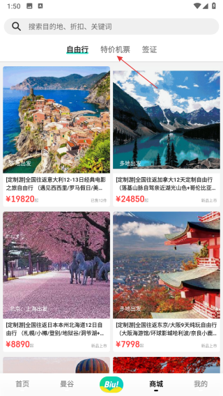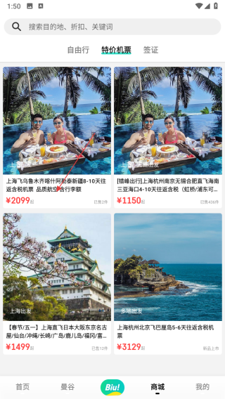 2、在商城页面中,点击特价机票标签,切换到特价机票展示界面。