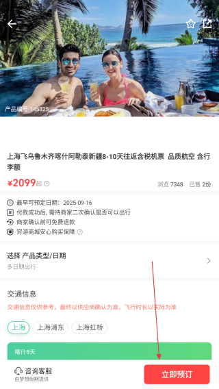 4、进入所选机票的详情页,查看信息后,点击立即预订按钮,按提示完成后续预订操作。